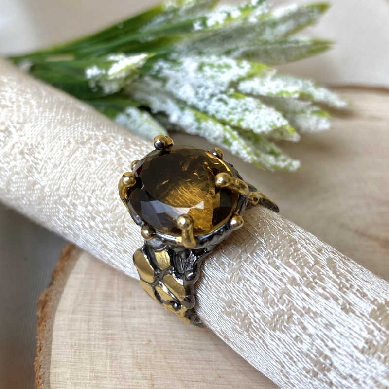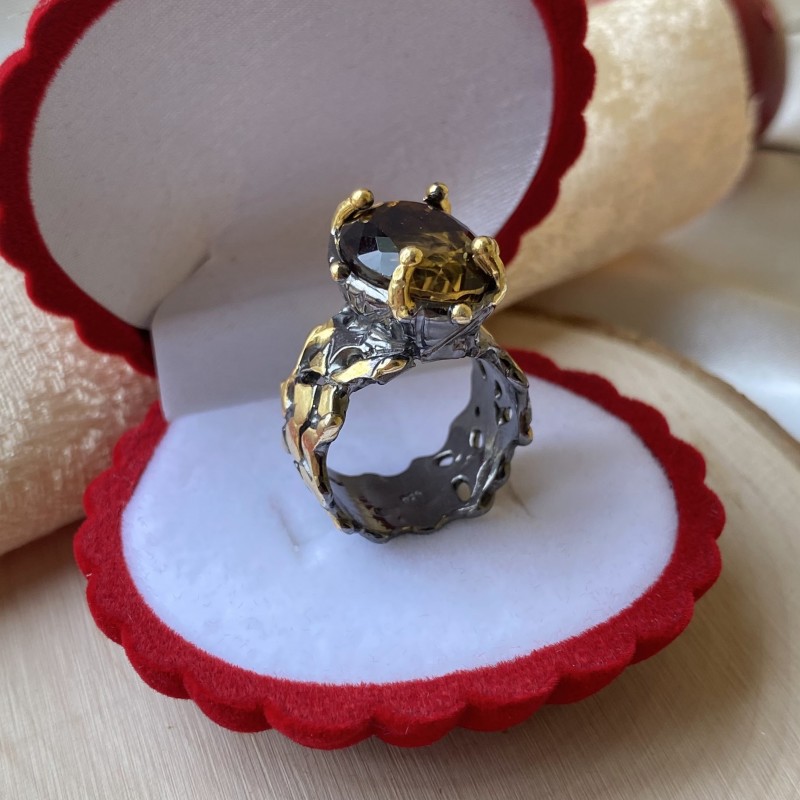 Ein bezaubernder Ring aus geschwärztem 925er Silber mit massiver Gelbgoldbeschichtung, verziert mit wunderschönen Rauchquarz. Durch gekonnt gesetzte Akzente mittels Vergoldung wirkt der Ring einzigartig schön. Eine hervorragende Ergänzung zu Ihrem Bild von Weiblichkeit und Romantik.