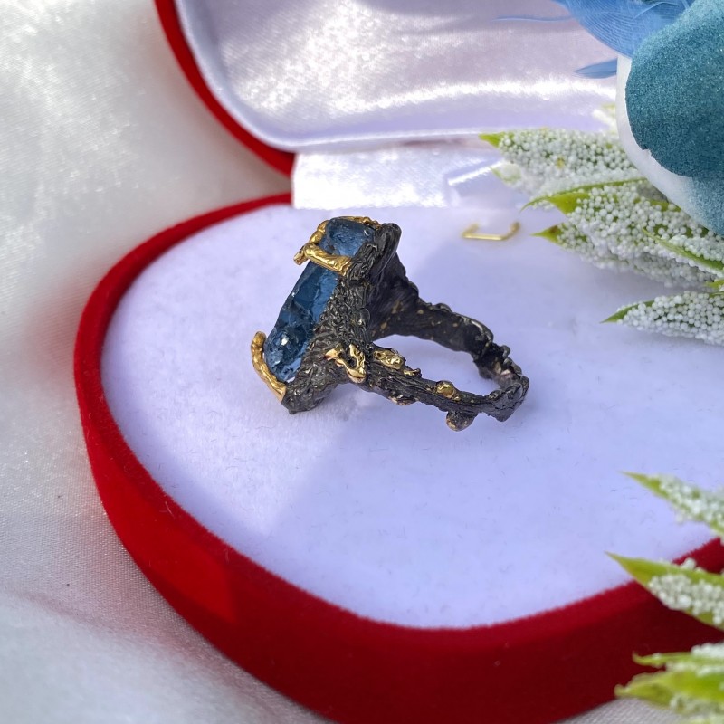 Ein bezaubernder Ring aus geschwärztem 925er Silber mit massiver Gelbgoldbeschichtung, verziert mit wunderschönen großen unverarbeiteten Topas und bunten Zirkonia. Durch gekonnt gesetzte Akzente mittels Vergoldung wirkt der Ring einzigartig schön. Eine hervorragende Ergänzung zu Ihrem Bild von Weiblichkeit und Romantik.