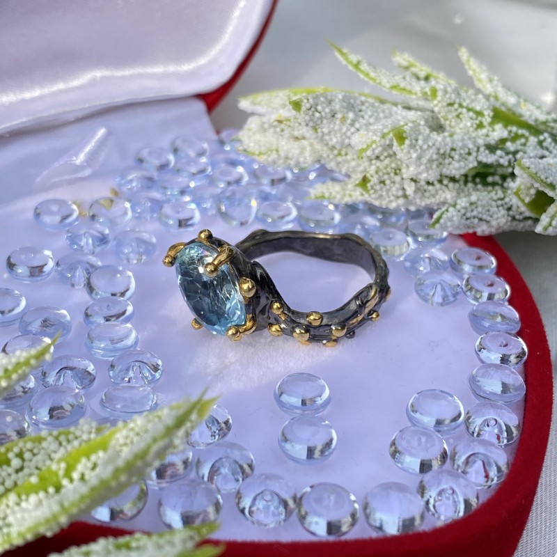 Ein bezaubernder Ring aus geschwärztem 925er Silber mit massiver Gelbgoldbeschichtung, verziert mit wunderschönen großen Topas. Durch gekonnt gesetzte Akzente mittels Vergoldung wirkt der Ring einzigartig schön. Eine hervorragende Ergänzung zu Ihrem Bild von Weiblichkeit und Romantik.