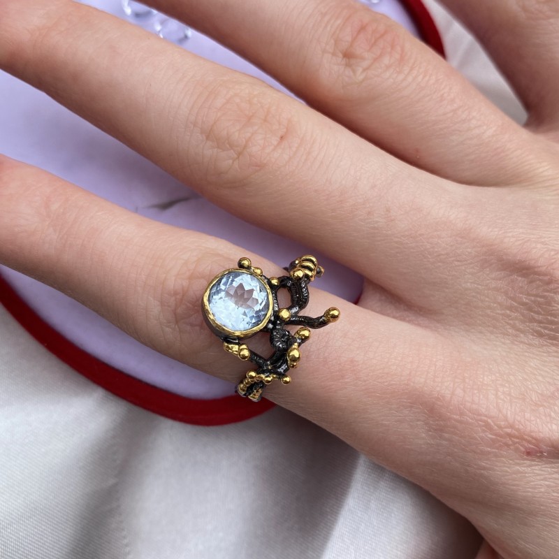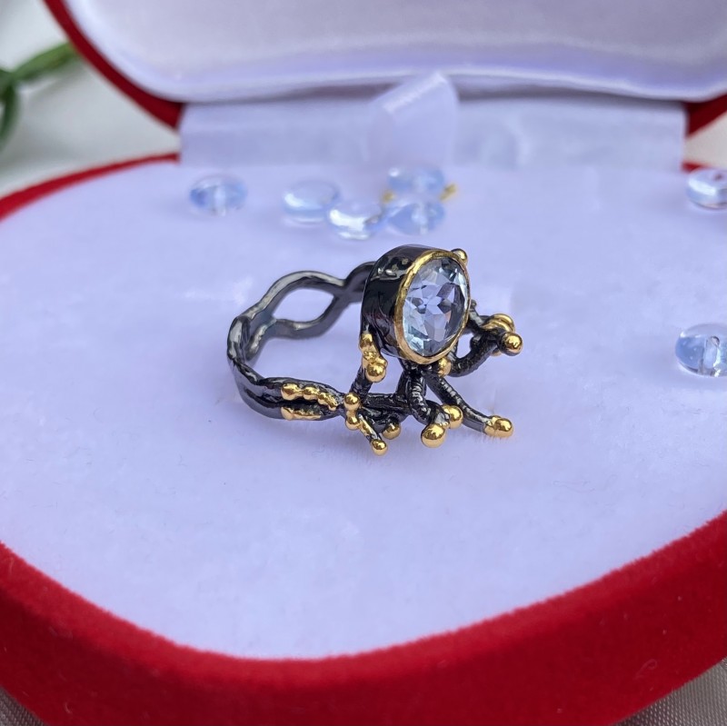 Ein bezaubernder Ring aus geschwärztem 925er Silber mit massiver Gelbgoldbeschichtung, verziert mit wunderschönen großen Topas. Durch gekonnt gesetzte Akzente mittels Vergoldung wirkt der Ring einzigartig schön. Eine hervorragende Ergänzung zu Ihrem Bild von Weiblichkeit und Romantik.