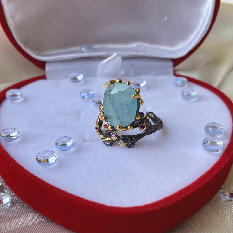 Ein bezaubernder Ring aus geschwärztem 925er Silber mit massiver Gelbgoldbeschichtung, verziert mit wunderschönen großen Aquamarin und bunten Zirkonia. Durch gekonnt gesetzte Akzente mittels Vergoldung wirkt der Ring einzigartig schön. Eine hervorragende Ergänzung zu Ihrem Bild von Weiblichkeit und Romantik.