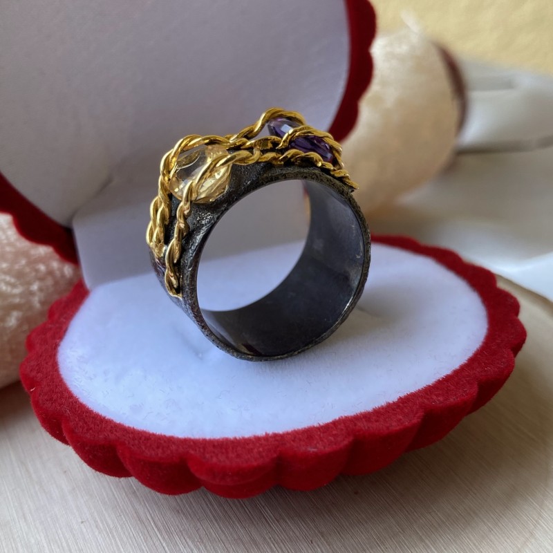 Ein bezaubernder Ring aus geschwärztem 925er Silber mit massiver Gelbgoldbeschichtung, verziert mit wunderschönen Citrin und Amethyst. Durch gekonnt gesetzte Akzente mittels Vergoldung wirkt der Ring einzigartig schön. Eine hervorragende Ergänzung zu Ihrem Bild von Weiblichkeit und Romantik.