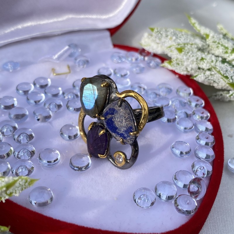Ein bezaubernder Ring aus geschwärztem 925er Silber mit massiver Gelbgoldbeschichtung, verziert mit wunderschönen großen Labradorit, Amethyst, Sodalith und bunten Zirkonia. Durch gekonnt gesetzte Akzente mittels Vergoldung wirkt der Ring einzigartig schön. Eine hervorragende Ergänzung zu Ihrem Bild von Weiblichkeit und Romantik.