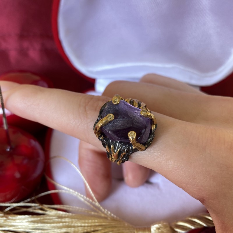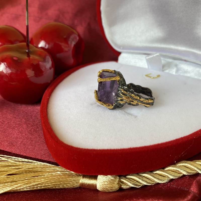 Ein bezaubernder Ring aus geschwärztem 925er Silber mit massiver Gelbgoldbeschichtung, verziert mit wunderschönen natürlichen unverarbeiteten Amethyst. Durch gekonnt gesetzte Akzente mittels Vergoldung wirkt der Ring einzigartig schön. Eine hervorragende Ergänzung zu Ihrem Bild von Weiblichkeit und Romantik.