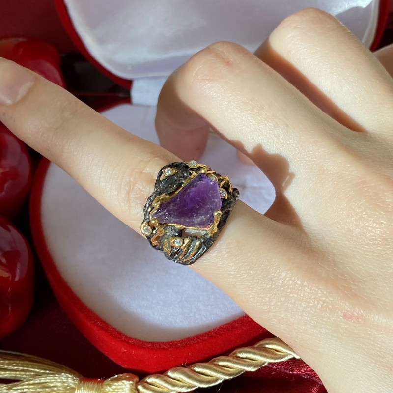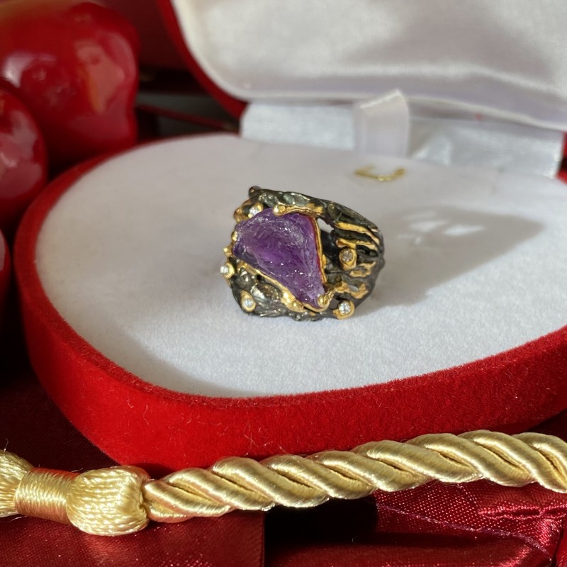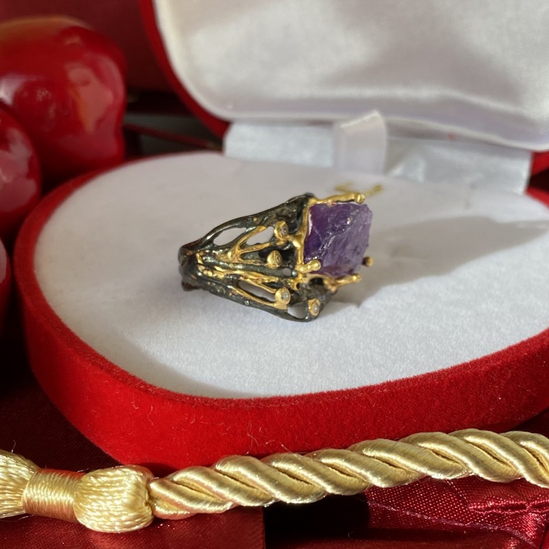 Ein bezaubernder Ring aus geschwärztem 925er Silber mit massiver Gelbgoldbeschichtung, verziert mit wunderschönen natürlichen unverarbeiteten Amethyst und funkelnden Zirkonia. Durch gekonnt gesetzte Akzente mittels Vergoldung wirkt der Ring einzigartig schön. Eine hervorragende Ergänzung zu Ihrem Bild von Weiblichkeit und Romantik.