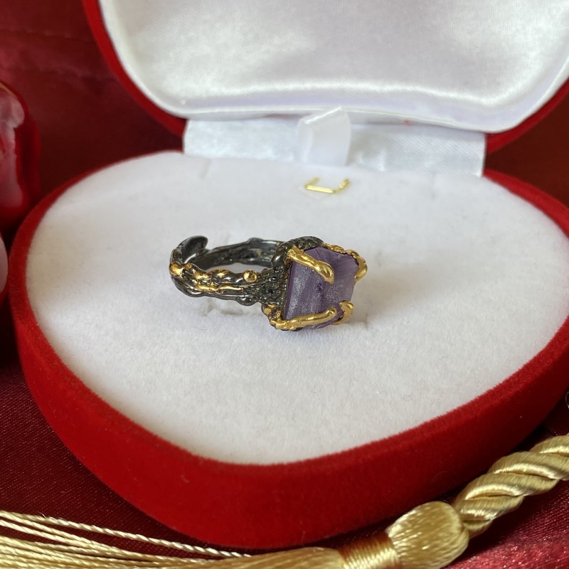Ein bezaubernder Ring aus geschwärztem 925er Silber mit massiver Gelbgoldbeschichtung, verziert mit wunderschönen natürlichen unverarbeiteten Amethyst. Durch gekonnt gesetzte Akzente mittels Vergoldung wirkt der Ring einzigartig schön. Eine hervorragende Ergänzung zu Ihrem Bild von Weiblichkeit und Romantik.