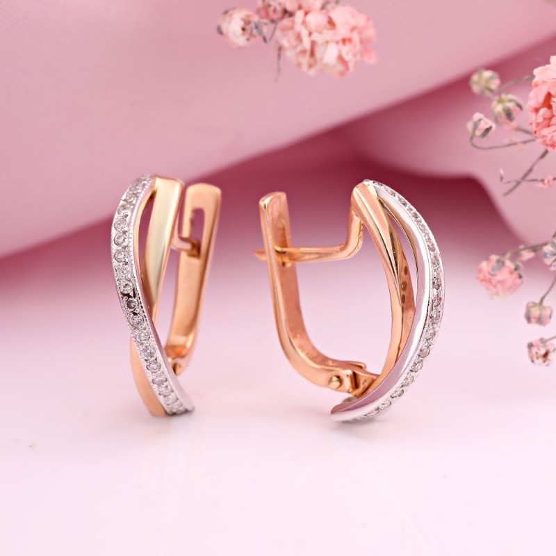 Bezaubernde feminine Ohrringe in Weiß/Rotgold 585 mit Einsätzen aus funkelnden Diamanten! Stil, Geschmack, Eleganz und Festlichkeit des Bildes werden perfekt betont! Das Verschenken einer Dekoration mit Diamanten ist eine großartige Gelegenheit, die Unveränderlichkeit Ihrer Gefühle für Ihren geliebten Menschen zu betonen. Ein Geschenk, das beim Beschenkten einen unvergesslichen Eindruck hinterlässt.