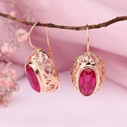 Шикарные серьги из красного золота 585 пробы, украшенные филигранью и рубинами корунд.