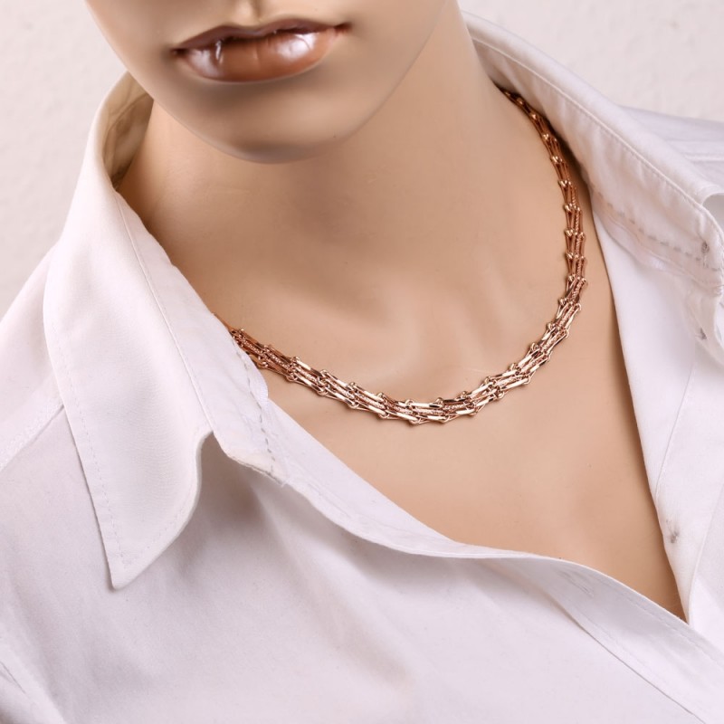 Eine zarte Halskette aus rotem 14-Karat-Gold, hergestellt mit einer speziellen Technologie, die trotz des voluminösen Eindrucks ein relativ geringes Gewicht und damit vergleichsweise niedrige Kosten ermöglicht.