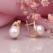 Bezaubernde Goldohrringe aus 585er rotem und weißem russischem Gold, verziert mit natürlichen weißen Zuchtperlen. Perlen sind von funkelnden Zirkonia umgeben! Diese Ohrringe strahlen Chic und Unwiderstehlichkeit aus! Schmuck aus Perlen unterstreicht den hohen sozialen Status seiner Besitzer und hebt sich von anderen Schmuckstücken ab.