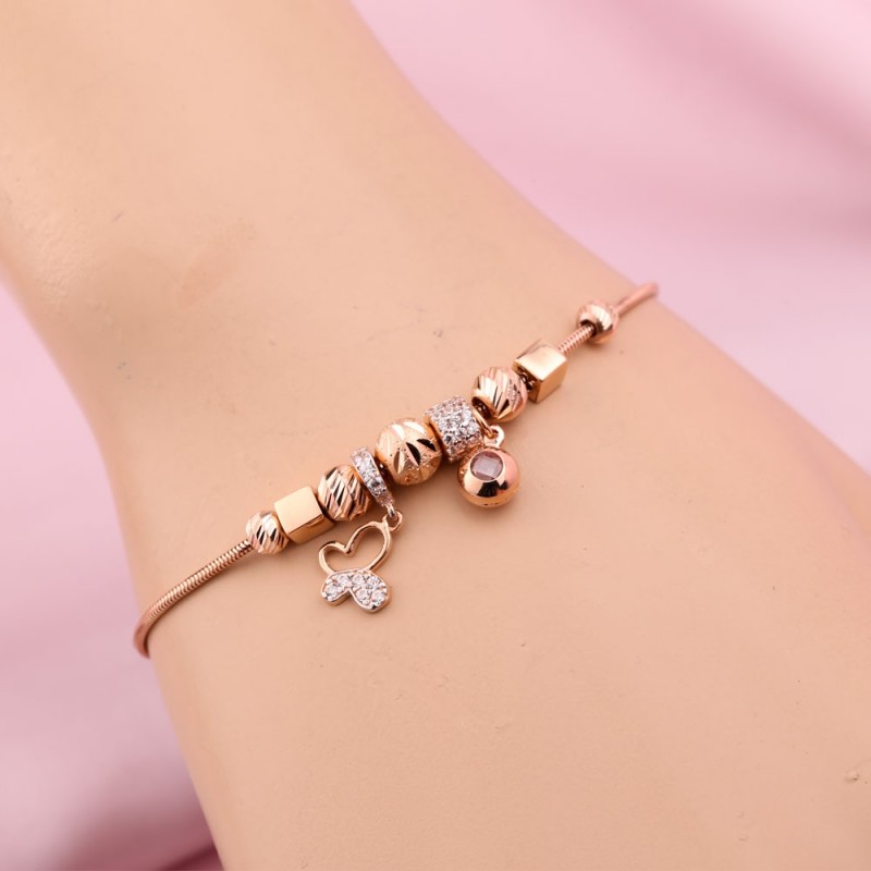 Rotgold. An der Webkette „Snake“ sind bezaubernde Anhänger mit Einsätzen aus funkelnden Zirkonias und diamantgeschliffenen Kugeln angebracht, die ihnen ein originelles Muster verleihen. Solch ein Armband wird elegante Frauenhände perfekt schmücken! Ein wunderbares Geschenk für einen geliebten Menschen!