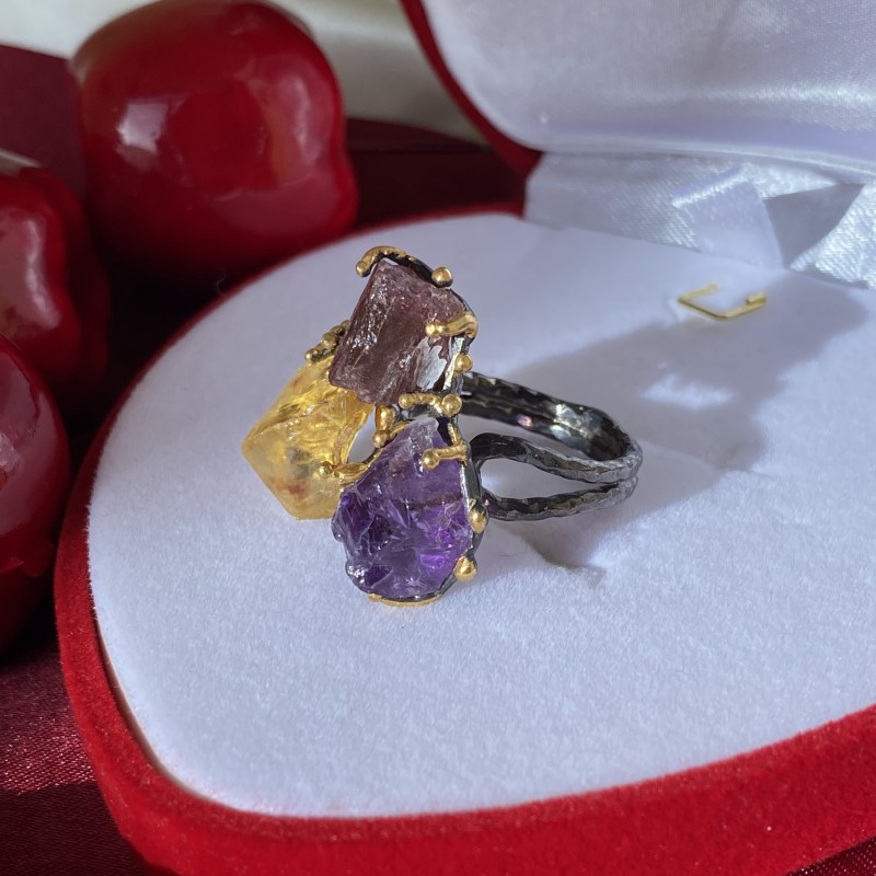 Ein bezaubernder Ring aus geschwärztem 925er Silber mit massiver Gelbgoldbeschichtung, verziert mit wunderschönen Citrin, Korund Rubin und Amethyst. Durch gekonnt gesetzte Akzente mittels Vergoldung wirkt der Ring einzigartig schön. Eine hervorragende Ergänzung zu Ihrem Bild von Weiblichkeit und Romantik.