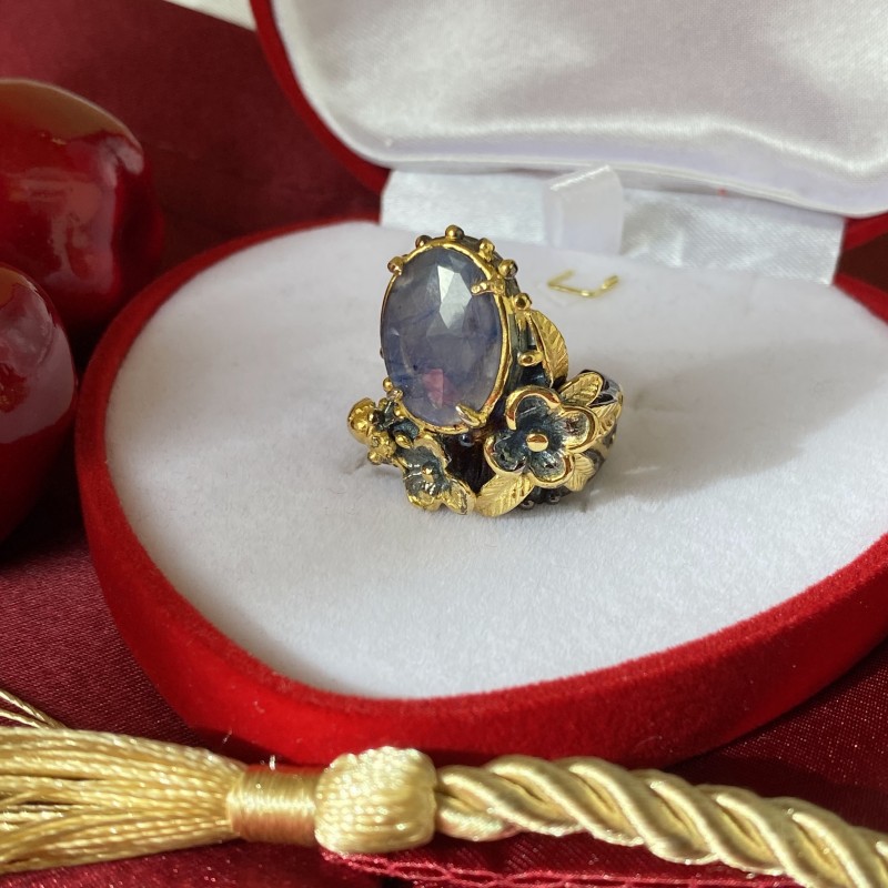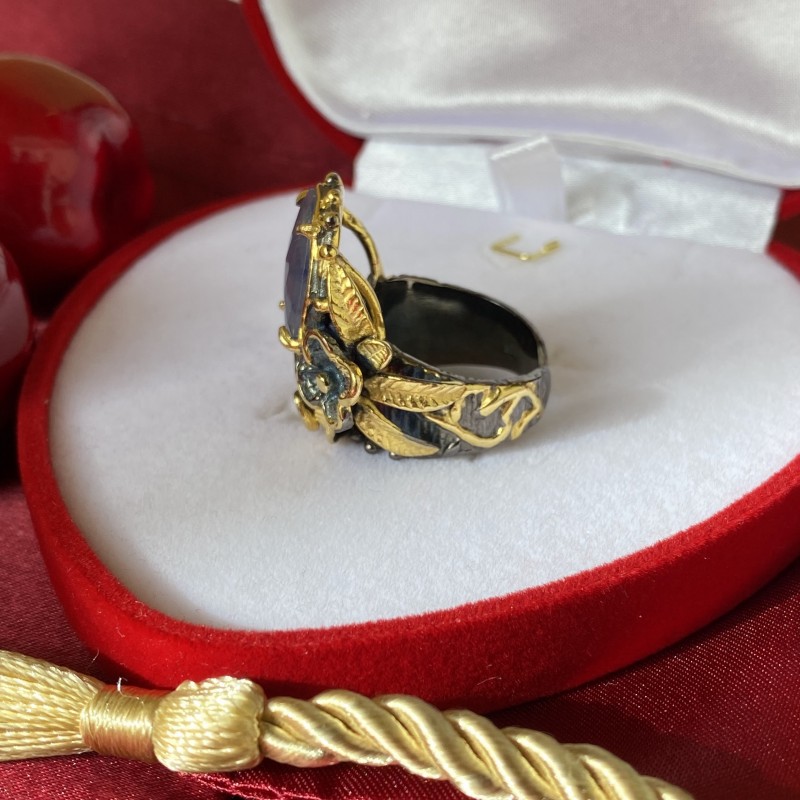 Ein bezaubernder Ring aus geschwärztem 925er Silber mit massiver Gelbgoldbeschichtung, verziert mit wunderschönen Amethyst. Durch gekonnt gesetzte Akzente mittels Vergoldung wirkt der Ring einzigartig schön. Eine hervorragende Ergänzung zu Ihrem Bild von Weiblichkeit und Romantik.