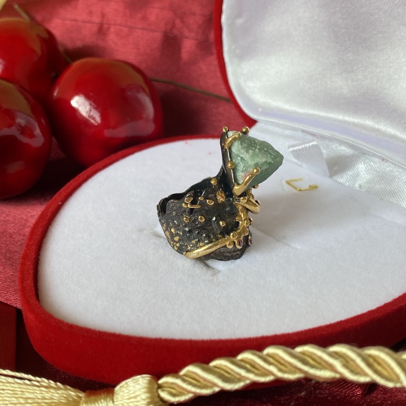 Ein bezaubernder Ring aus geschwärztem 925er Silber mit massiver Gelbgoldbeschichtung, verziert mit wunderschönen Chrysopras und bunten Zirkonia. Durch gekonnt gesetzte Akzente mittels Vergoldung wirkt der Ring einzigartig schön. Eine hervorragende Ergänzung zu Ihrem Bild von Weiblichkeit und Romantik.