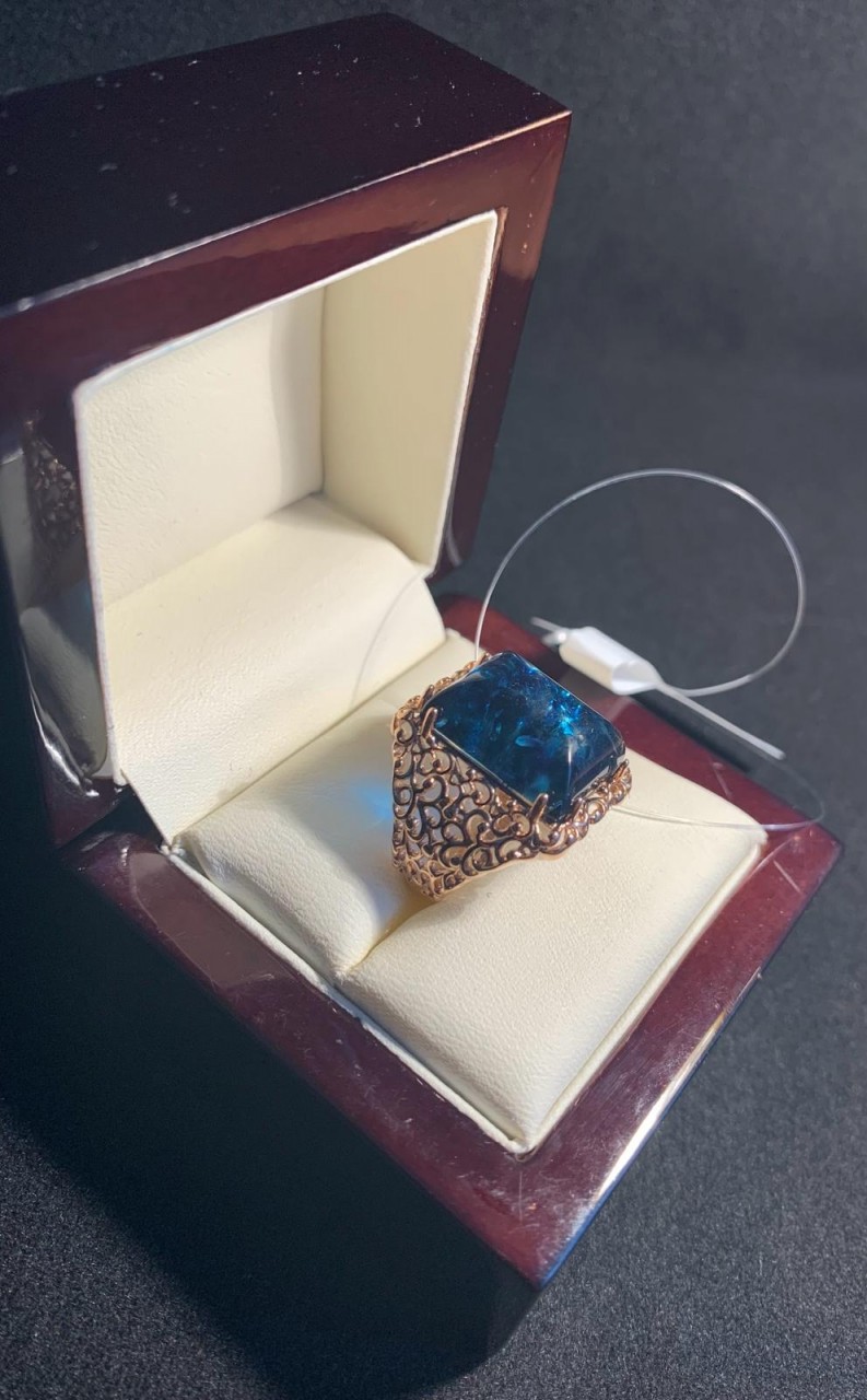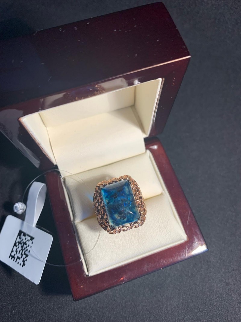 Eleganter Ring aus rotvergoldetem 925er Silber, verziert mit Bernstein, mit diesem erstaunlichen "Stück der Sonne". Gefertigt durch eine spezielle Technologie, bei der ein blaues Substrat auf die Unterseite von zitronenfarbenem Bernstein hinzugefügt wird. Aufgrund der Lichtdurchlässigkeit von Bernstein entsteht eine so besondere Farbe. Der Ring wird die Zärtlichkeit, den Charme und die Natürlichkeit Ihrer Schönheit perfekt betonen und die Aufmerksamkeit auf die Weiblichkeit Ihrer Hände lenken.
