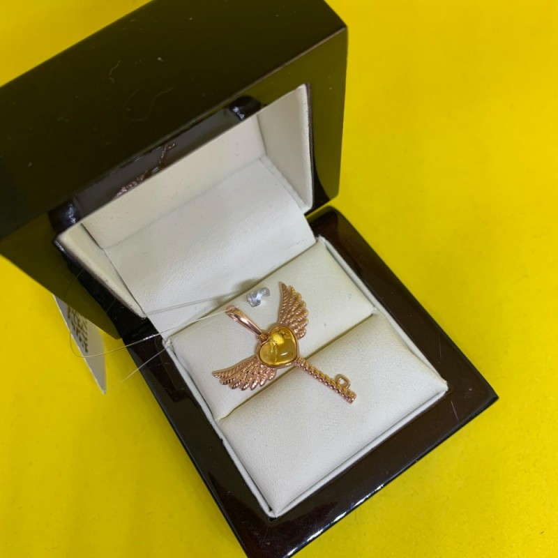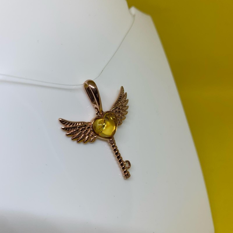 Ein charmanter Anhänger aus rotvergoldetem 925er Silber und einzigartigem Bernstein, mit diesem erstaunlichen "Stück der Sonne", das mit allen Gelbtönen spielt. Eine einzigartige Gelegenheit, Ihre Individualität zu betonen, das Bild von Weiblichkeit, Sonnenschein und Zärtlichkeit zu vermitteln.