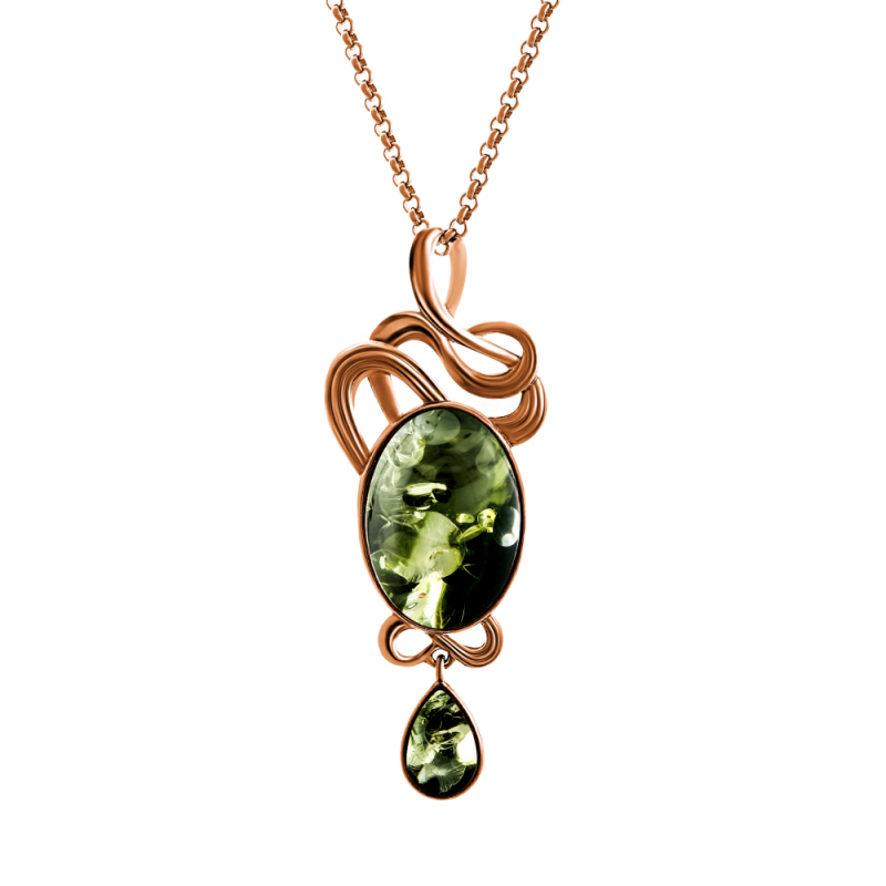 Grüner Bernstein ist eine erstaunliche Vielfalt dieses Steins, dessen Schönheit durch seine tiefe Farbe und ausdrucksstarke Brillanz betont wird. Dieser Farbton sieht in vergoldetem Silber am vorteilhaftesten aus. Es schattiert die Farbe des Bernsteins günstig, betont seine Struktur, fügt zusätzliche Ausstrahlung hinzu. Silberschmuck mit grünem Bernstein ist ein besonderes Accessoire, das perfekt in den Alltag passt, und als Ergänzung zu einem Büroanzug oder Abendkleid.