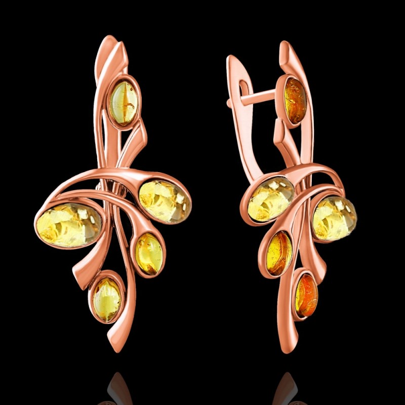 Wunderschöne Ohrringe aus rotvergoldetem Silber 925 Probe, mit Bernstein in Honigtönen, erstaunlichen "Stück der Sonne"! Eine einzigartige Gelegenheit, Ihre Individualität zu betonen, das Bild von Weiblichkeit, Sonnenschein und Zärtlichkeit zu vermitteln.