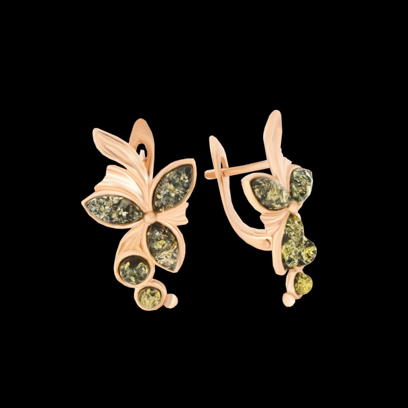 Wunderschöne Ohrringe aus Silber 925 Probe, mit grünem Bernstein, erstaunlichen "Stück der Sonne" und Rotvergoldung! Eine einzigartige Gelegenheit, Ihre Individualität zu betonen, das Bild von Weiblichkeit, Sonnenschein und Zärtlichkeit zu vermitteln.