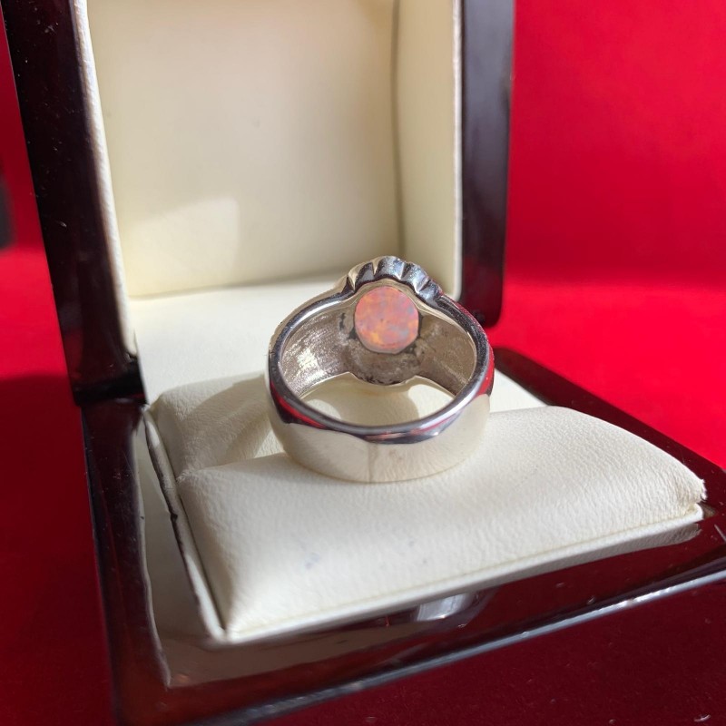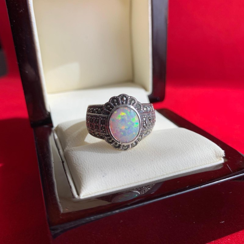 Wunderschöner Ring aus geschwärztem 925er Sterlingsilber mit bezaubernden Opal- und tiefen Markasit-Einsätzen. Ein solcher Ring wird die Verfeinerung des Geschmacks betonen und Ihnen das Gefühl geben, eine echte Königin zu sein.