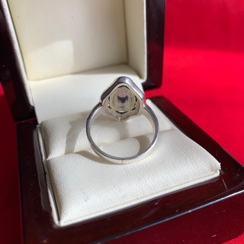 Wunderschöner Ring aus geschwärztem 925er Sterlingsilber mit bezaubernden Opal- und tiefen Markasit-Einsätzen. Ein solcher Ring wird die Verfeinerung des Geschmacks betonen und Ihnen das Gefühl geben, eine echte Königin zu sein.
