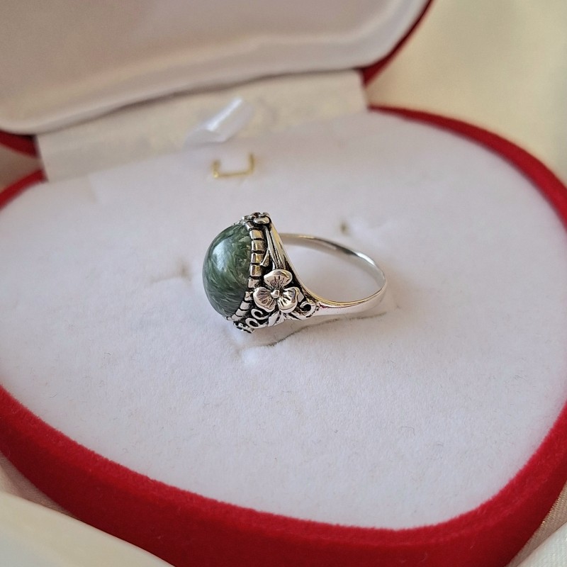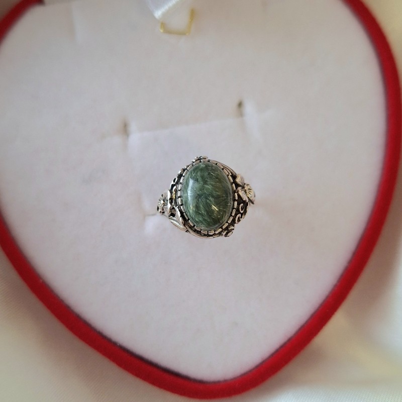 Herrlicher zarter Ring mit charmanten Clinochlor in einem schönen Silberrahmen aus geschwärztem 925er Silber.