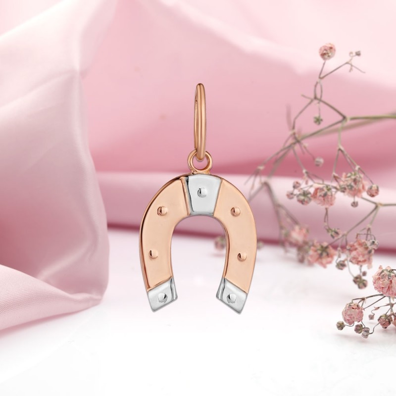 Bezaubernder doppelseitiger Anhänger aus 585er Rot- und Weißgold. Auf der einen Seite ist der Anhänger mit einem Diamantschliff-Design verziert, auf der anderen Seite mit einer Kombination aus Weiß- und