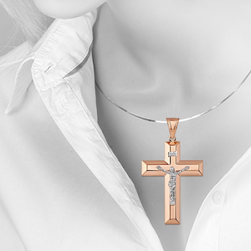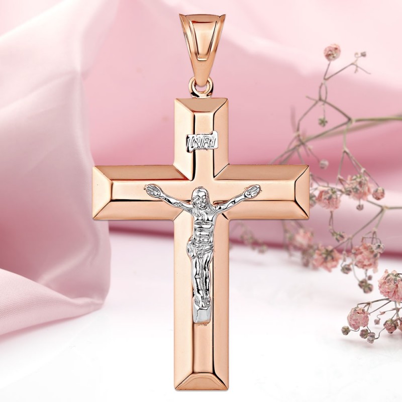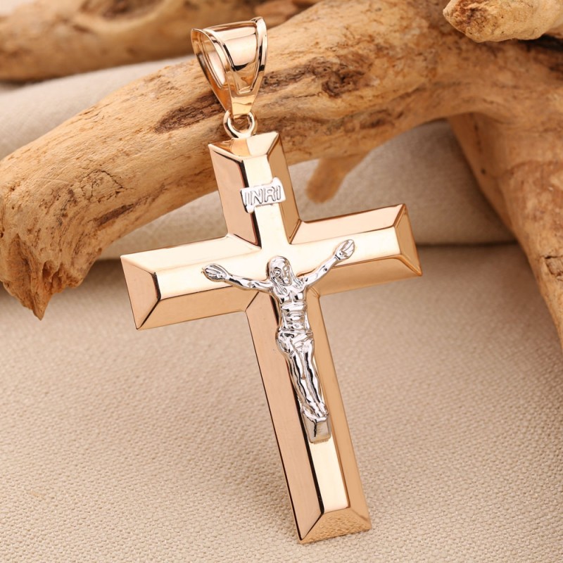 Russisches Gold 585 in Deutschland Kreuzanhänger mit einem Kruzifix aus 585er Weiß/Rotgold. Die Christusfigur besteht aus Weißgold. Auf der Rückseite des Kreuzes ist ein Schutzgebet „Rettet und bewahrt“ eingraviert. Oben am Kreuz befindet sich ein Ring für eine Kordel oder Kette. Kratzt nicht beim Tragen.
