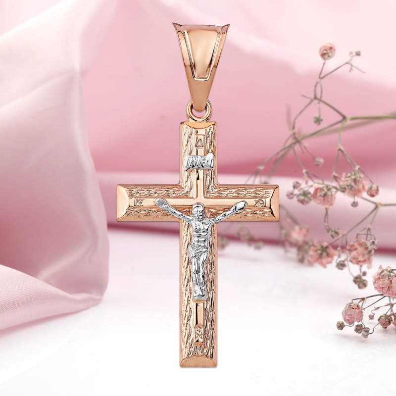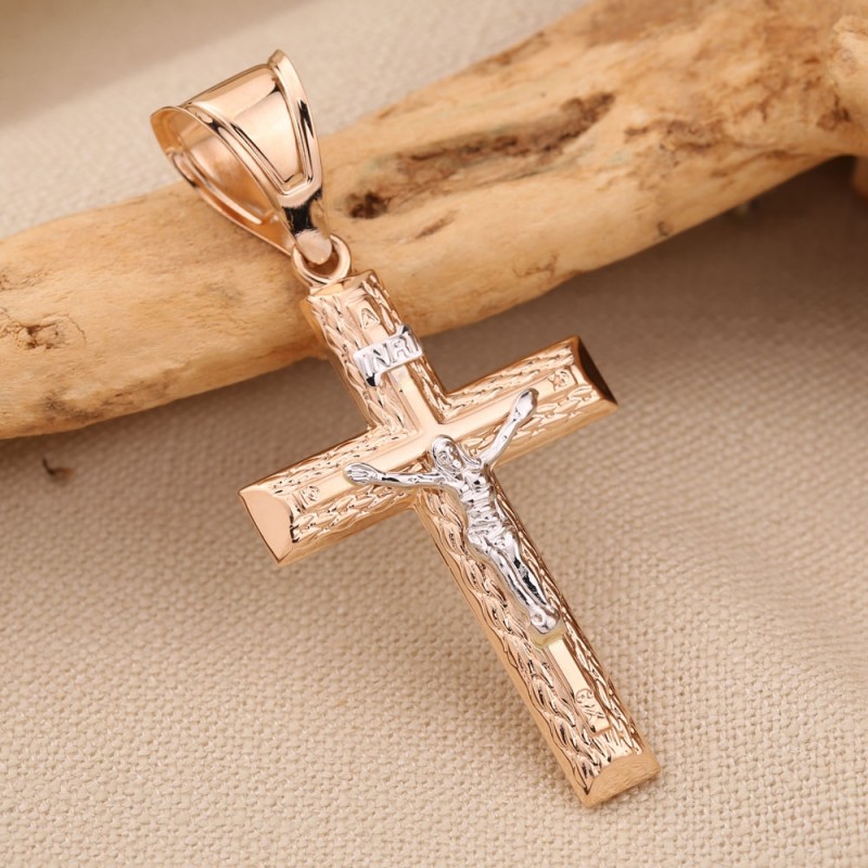 Russisches Gold 585 in Deutschland Kreuzanhänger mit einem Kruzifix aus 585er Weiß/Rotgold. Die Christusfigur und die Inschrift „INRI“ bestehen aus Weißgold. Auf der Rückseite des Kreuzes ist ein Schutzgebet „Rettet und bewahrt“ eingraviert. Oben am Kreuz befindet sich ein Ring für eine Kordel oder Kette. Kratzt nicht beim Tragen.