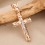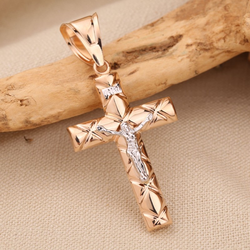 Russisches Gold 585 in Deutschland Kreuzanhänger mit einem Kruzifix aus 585er Weiß/Rotgold. Die Christusfigur und die Inschrift „INRI“ bestehen aus Weißgold. Auf der Rückseite des Kreuzes ist ein Schutzgebet „Rettet und bewahrt“ eingraviert. Oben am Kreuz befindet sich ein Ring für eine Kordel oder Kette. Kratzt nicht beim Tragen.