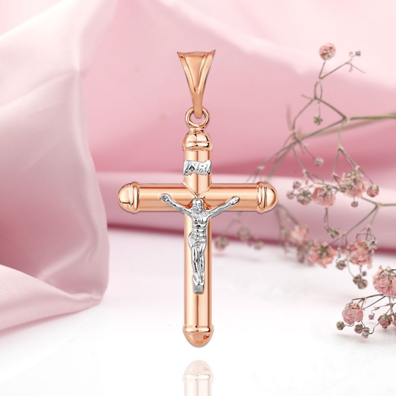 Goldkreuzanhänger mit Kruzifix aus 585er Weiß/Rotgold. Die Christusfigur und die Inschrift „INRI“ bestehen aus Weißgold. Auf der Rückseite des Kreuzes ist ein Schutzgebet „Rettet und bewahrt“ eingraviert. Oben am Kreuz befindet sich ein Ring für eine Kordel oder Kette. Kratzt nicht beim Tragen.