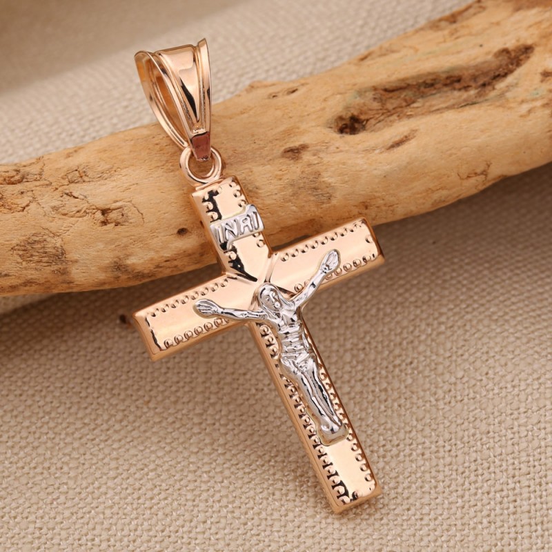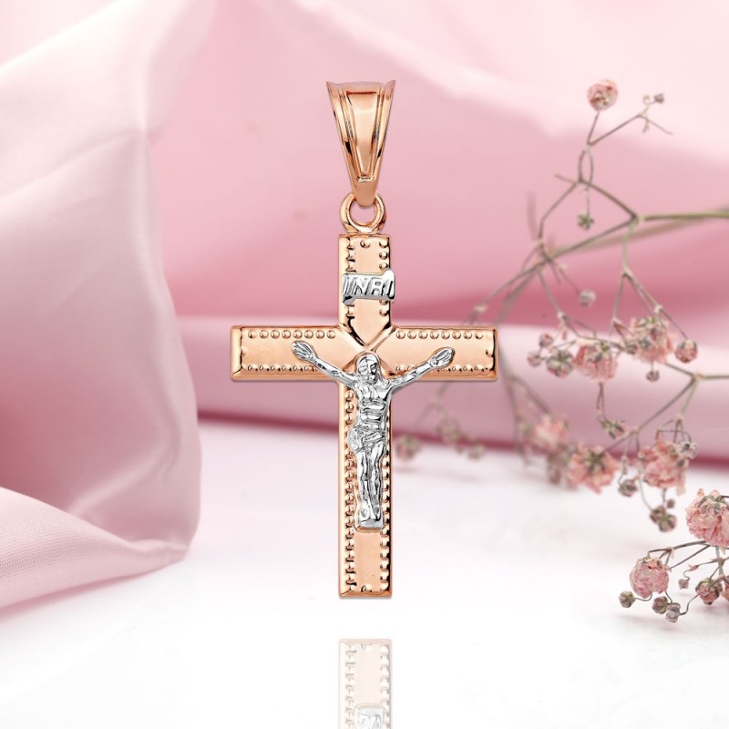 Goldkreuzanhänger mit Kruzifix aus 585er Weiß/Rotgold. Die Christusfigur und die Inschrift „INRI“ bestehen aus Weißgold. Auf der Rückseite des Kreuzes ist ein Schutzgebet „Rettet und bewahrt“ eingraviert. Oben am Kreuz befindet sich ein Ring für eine Kordel oder Kette. Kratzt nicht beim Tragen.