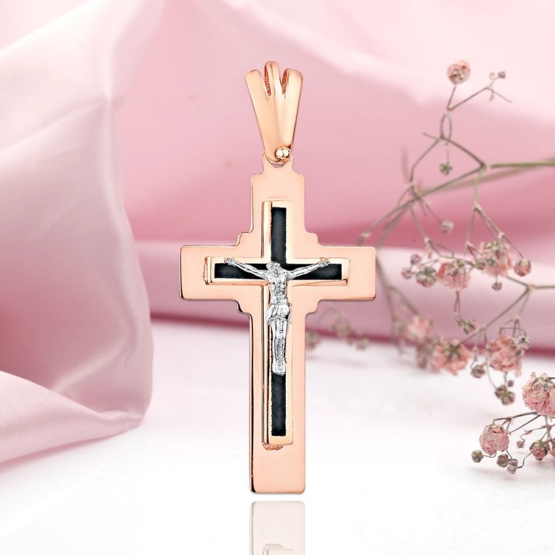 Goldenes Kreuzanhänger mit einem Kruzifix aus 585er Weiß/Rotgold auf schwarzen Emaillehintergrund. An der Spitze des Kreuzes befindet sich ein Ring für eine Schnur oder Kette. Kratzt nicht beim Tragen.