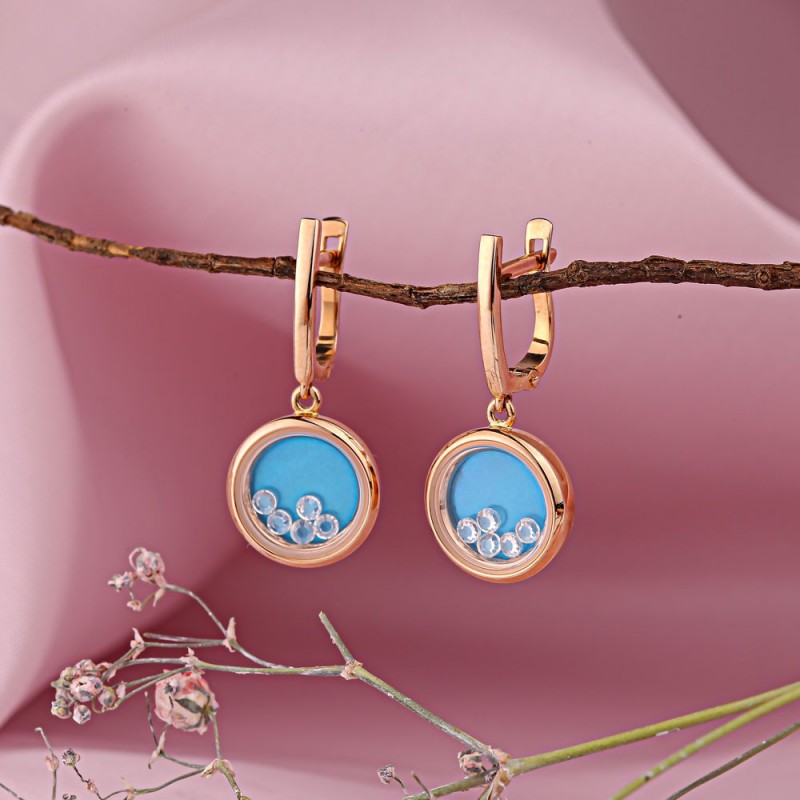 Rotgold, verziert mit Kristallanhängern auf einem Hintergrund aus farbiger Emaille. Auf der Unterseite der Ohrringe ist der Name des Herstellers eingraviert. Eine ausgezeichnete Wahl, um sich selbst und Ihren Lieben eine Freude zu machen.