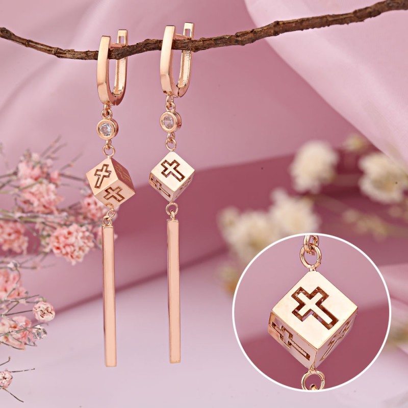 Rotgold mit Zirkonia. Zarte und feminine Ohrhänger verziert mit Anhängern mit Einsatz aus Zirkonia und Würfel mit Kreuzgravur. Eine ausgezeichnete Wahl, um sich selbst und Ihren Lieben eine Freude zu machen.