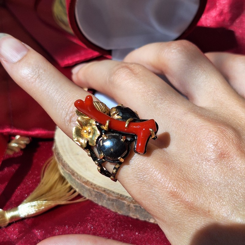 Ein bezaubernder Ring aus geschwärztem 925er Silber mit massiver Gelbgoldbeschichtung, verziert mit wunderschönen großen Korallen. Durch gekonnt gesetzte Akzente mittels Vergoldung wirkt der Ring einzigartig schön. Eine hervorragende Ergänzung zu Ihrem Bild von Weiblichkeit und Romantik.
