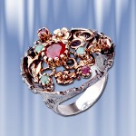 Кольцо из красного золота с рубинами и бриллиантом.