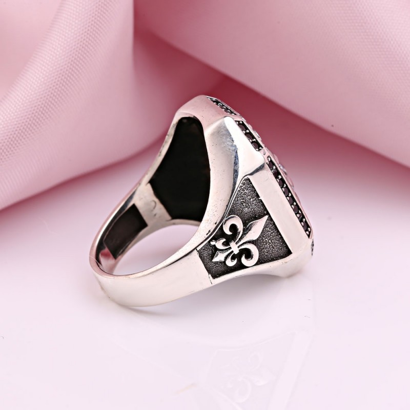 Herrenring aus 925 Silber in Deutschland kaufen. Herrenring aus geschwärztem 925er Sterlingsilber in ungewöhnlichem Design in der Technik der Schwärzung von Silber mit einem Reliefbild. Einsatz: schwarzes Zirkonia