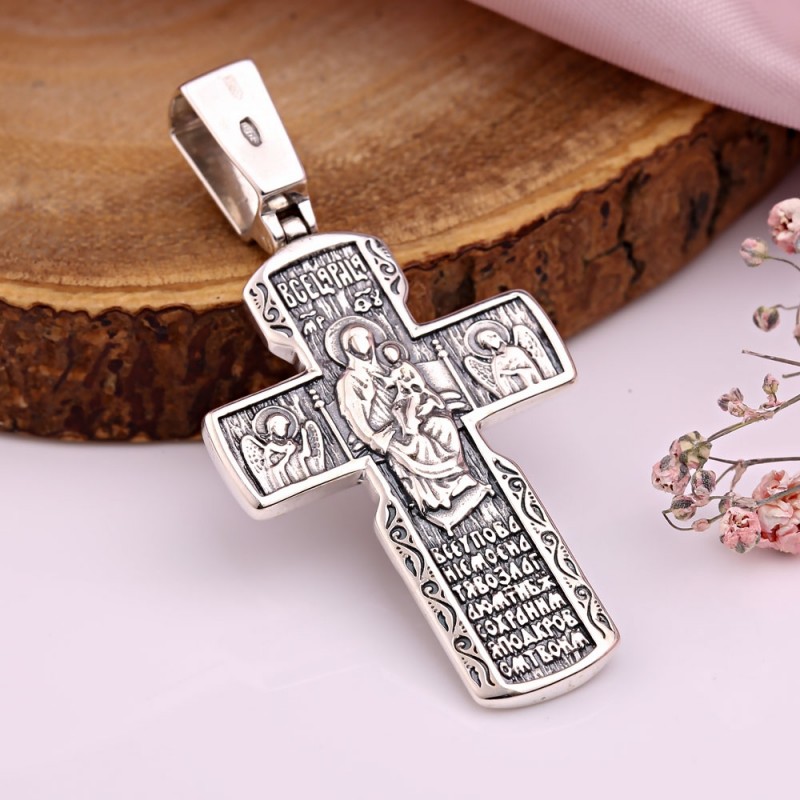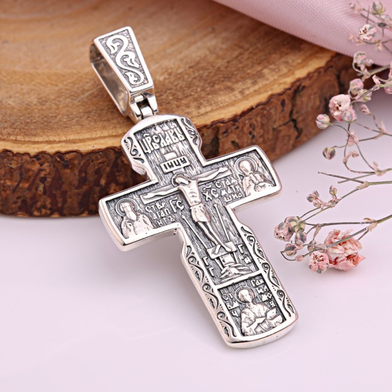Silbernes Brustkreuz mit Kruzifix aus geschwärztem 925er Sterlingsilber! Auf der Rückseite befindet sich eingraviertes Gebet. Kratzt beim Tragen nicht.