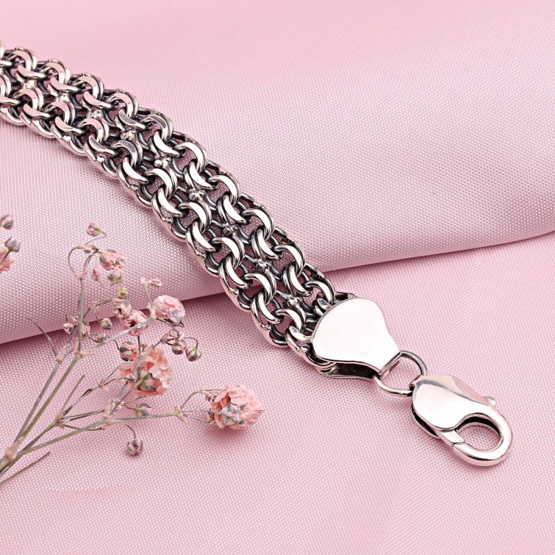 Armband aus 925er Sterlingsilber in Deutschland. Klassisches Armband aus 925er-Sterlingsilber mit diamantgeschliffenem Doppelstrangbismarck. Die Bismarckweberei gilt als eine der schönsten und langlebigsten. Dies ist ein komplexes, aber spektakuläres Stricken, das einen starken Griff der Glieder bietet. Bismarck kann einfach, doppelt oder dreifach sein, es gibt Dekorationen mit 4 Reihen von Links. Ketten und Armbänder, die mit der Technologie des Webens von Bismarck hergestellt werden, sehen attraktiv und solide aus und sind daher bei Menschen, die die Kombination aus Schönheit und Praktikabilität zu schätzen wissen, sehr gefragt.