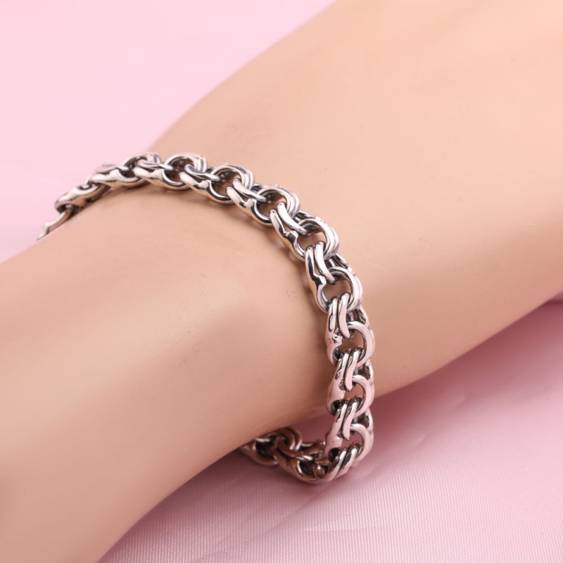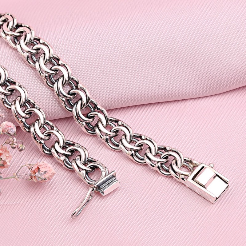 Armband aus 925er Sterlingsilber in Deutschland. Klassisches Armband aus 925er-Sterlingsilber mit diamantgeschliffenem Bismarck. Die Bismarckweberei gilt als eine der schönsten und langlebigsten. Dies ist ein komplexes, aber spektakuläres Stricken, das einen starken Griff der Glieder bietet. Bismarck kann einfach, doppelt oder dreifach sein, es gibt Dekorationen mit 4 Reihen von Links. Ketten und Armbänder, die mit der Technologie des Webens von Bismarck hergestellt werden, sehen attraktiv und solide aus und sind daher bei Menschen, die die Kombination aus Schönheit und Praktikabilität zu schätzen wissen, sehr gefragt.