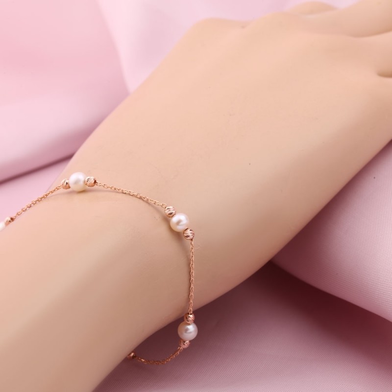 Rotgold, verziert mit goldenen diamantgeschliffenen Zierperlen und natürlichen Zuchtperlen. Kette - Ankergeflecht mit Diamantschliff.