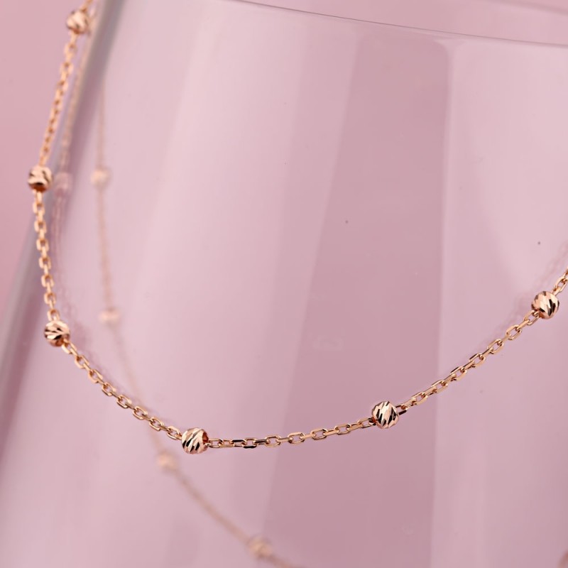 красного золота 585 пробы, украшенное вставками в виде декоративных шариков алмазной огранки. Цепь - якорное плетение с алмазной огранкой. Если вы хотите подчеркнуть в вашей спутнице ее женственность, грацию, улыбку и красоту, то такой подарок сделает это как нельзя лучше.