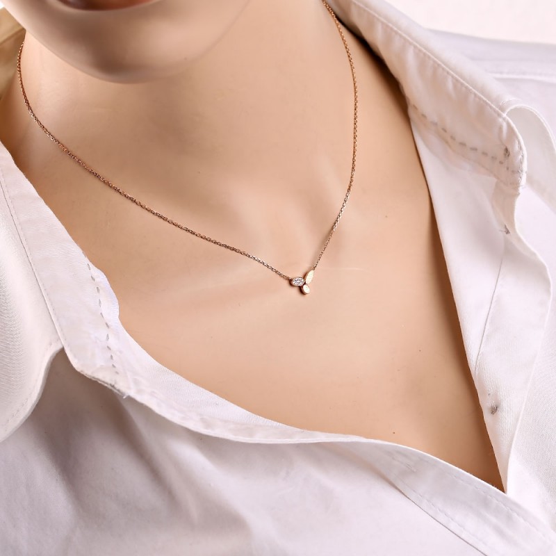 Rotgold, verziert mit funkelnden Zirkonia. Kette - Ankergeflecht mit Diamantschliff. Wenn Sie bei Ihrer Begleiterin ihre Weiblichkeit, Anmut, ihr Lächeln und ihre Schönheit betonen möchten, dann ist ein solches Geschenk genau das Richtige für Sie.