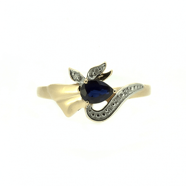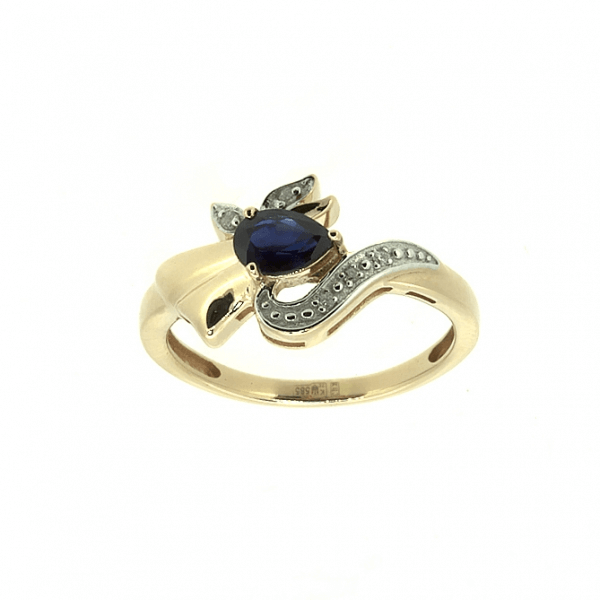 Eine Schleifenring aus Rotgold mit einem Saphir und Diamanten.