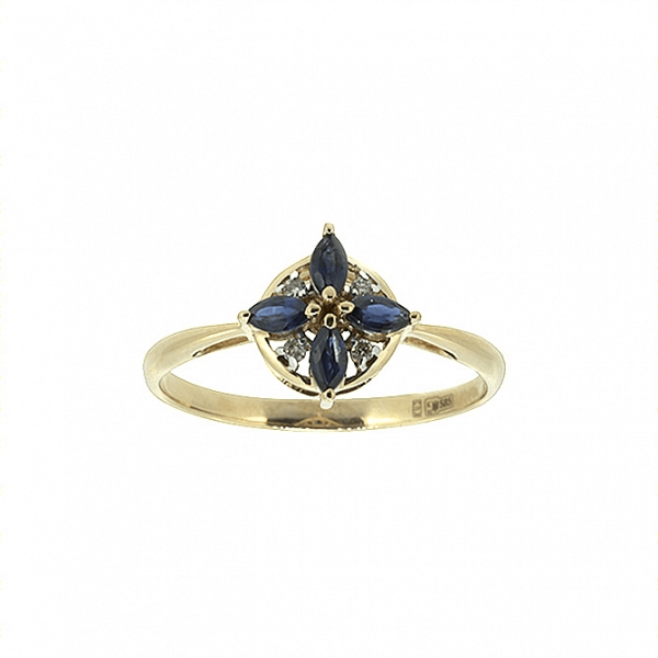 Leichter Blumenring aus Rotgold mit Saphiren und Diamanten.