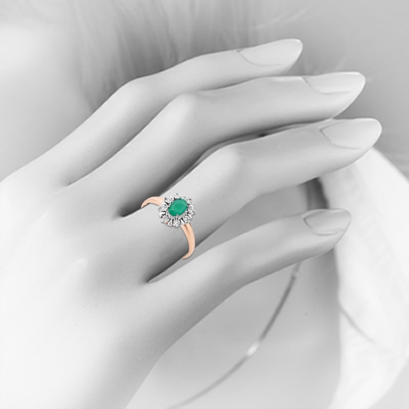 Rotgold mit Weißgoldakzenten, die die Schönheit der Steine perfekt zur Geltung bringen. Ein sehr zarter und stilvoller Goldring mit einem leuchtenden Smaragd und funkelnden Diamanten. Smaragd symbolisiert Weisheit und Diamanten symbolisieren Wohlstand, daher ist ein Geschenk in Form eines Goldrings mit solchen Steinen ein würdiges Geschenk!