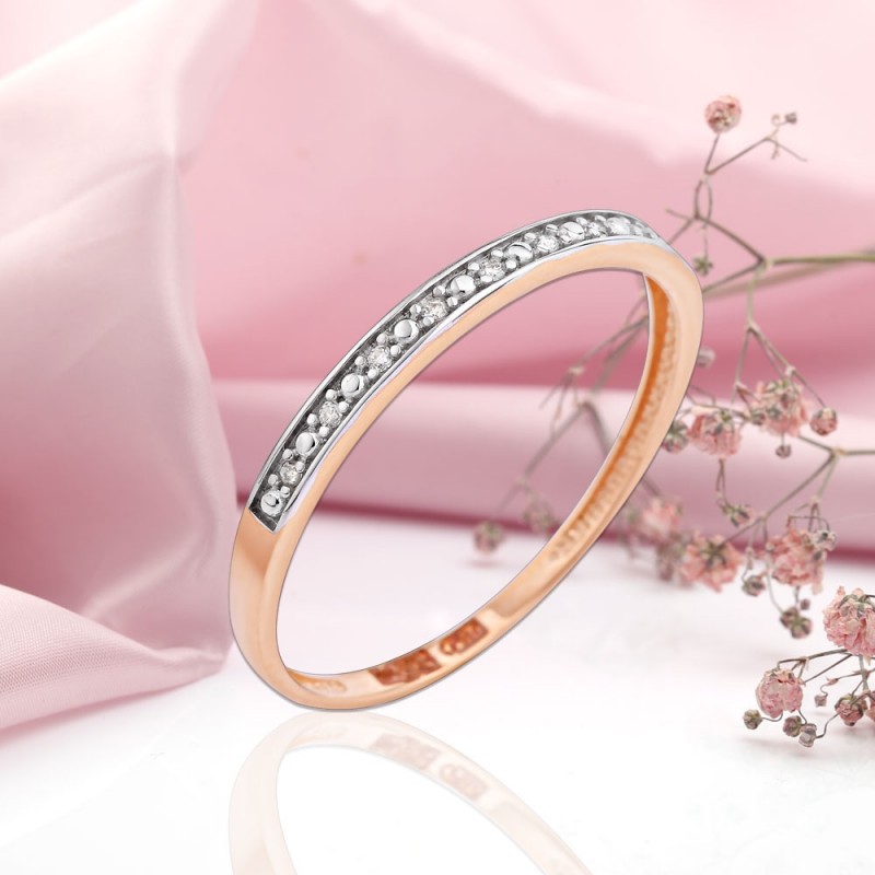Rotgold mit Akzenten aus Weißgold, die das Funkeln und die einzigartige Schönheit der Diamanten perfekt hervorheben. Ein eleganter Goldring mit Diamanten für schöne Frauenfinger! Natürlich träumt jede Frau von einem so unvergesslichen und unvergesslichen Geschenk wie einem Goldring mit Diamant.