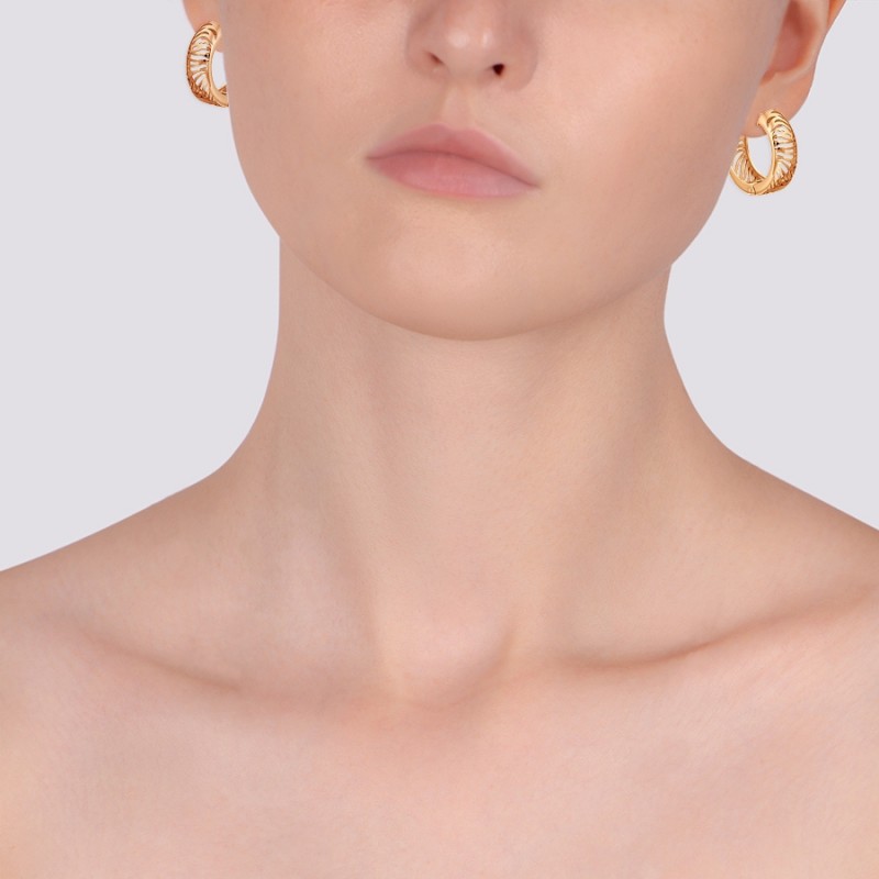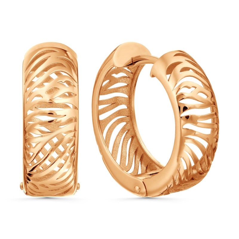 Rotgold liegt in seiner Stärke, Widerstandsfähigkeit gegen Lasten und Haltbarkeit. Diese Vorteile ermöglichen es Ihnen, leichten durchbrochenen Schmuck zu kreieren, ohne befürchten zu müssen, dass das Material schnell seine Form verliert oder geätzt wird.Schmuck aus rotem Material sieht toll aus, auch wenn er nicht von Edelsteinen instruiert wird. Solche Produkte eignen sich für jede Art von Haut, schmücken eine Frau jeden Alters und geben den Anschein von Raffinesse und Eleganz.