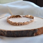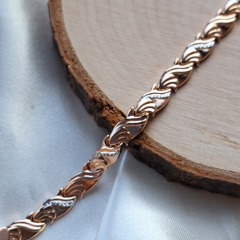 Rotgold des 585er-Standards mit Akzenten aus Weißgold mit Diamantschliff. Fantasieweben. Eine wunderbare Dekoration für Ihr Handgelenk. Dieses Produkt unterstreicht Raffinesse und ein ausgeprägtes Stilgefühl!